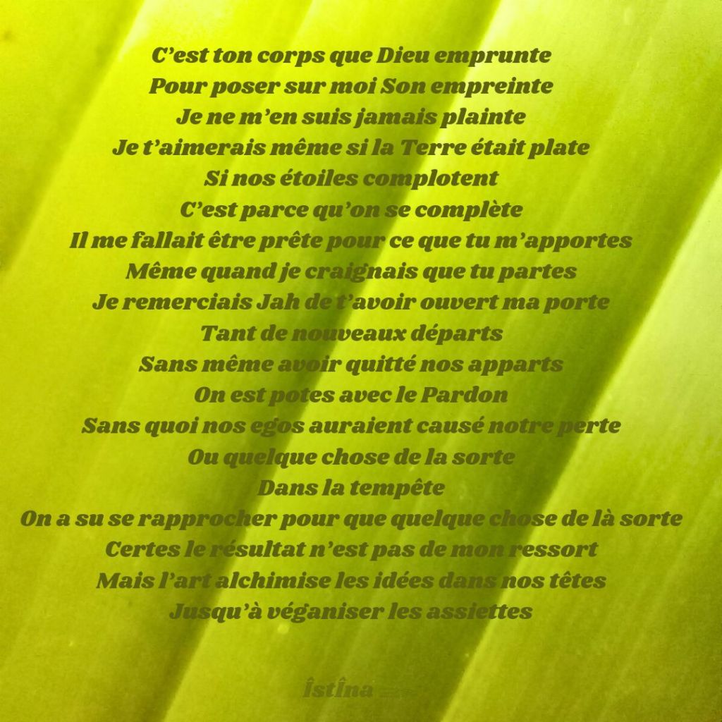 Ma gratitude est infinie envers mon Bien-Aimé car je sais qu’à l’instar de Dieu, que quelles que soient mes émotions, mes imperfections, mes préoccupations humaines ; quelle que soit ma passion, mon enthousiasme irréfréné parfois “inapproprié” ; quelle que soit même la résurgence de doutes du passé, le résultat de traumatismes ou de drames que personne n’aurait choisi de vivre ; quel que soit enfin le décalage entre Qui Je Suis et la façon dont Je Me manifeste, parfois chaotique ou incohérente aux yeux des profanes… Cet Amour reste là , inaltérable, inchangé depuis la première fois que j’en ai rêvé en regardant la plus brillante étoile. Il est là de tout Éternité, et j’en suis digne, et je le sens enfin, tout comme tu es digne d’être accueilli TEL•LE QUE TU ES dans la Grâce et la plénitude de l’Amour et de la Paix. En tant qu’enfant de la Création tu ne peux manquer de rien.