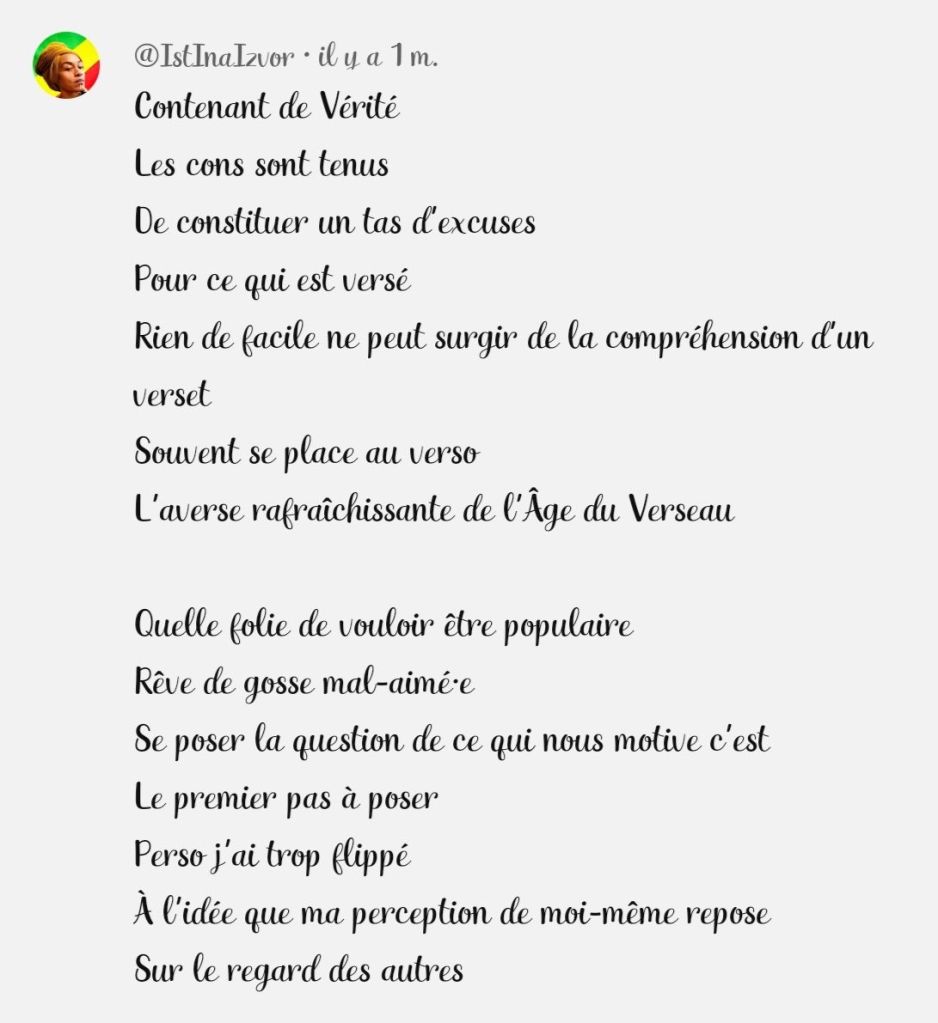 De l’improbabilité de l’existence du hasard, et du besoin humain de trouver un sens à sa propre existence, voire à la création tout court, j’ai extrait un sens aigu de ma mission liée à mon nom qui signifie Source de Vérité et qui est un chemin de croix voulu par les Ancêtres, par mon âme et par la volonté du Tout-Puissant.